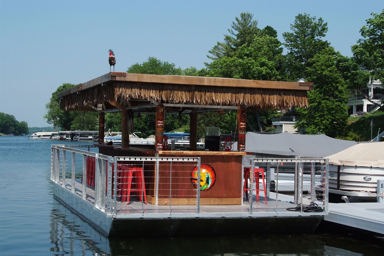 Come experience the ultimate lake life vibe at our Tiki Barge, docked at beautiful Island Park, just across from the Golden Mast. Don’t have a boat? No problem! Hop on the Tin Can Shuttle, running weekends only, for a fun and easy ride from the Golden Mast. Local boaters are welcome to tie up in one of our available dock slips and join the party.